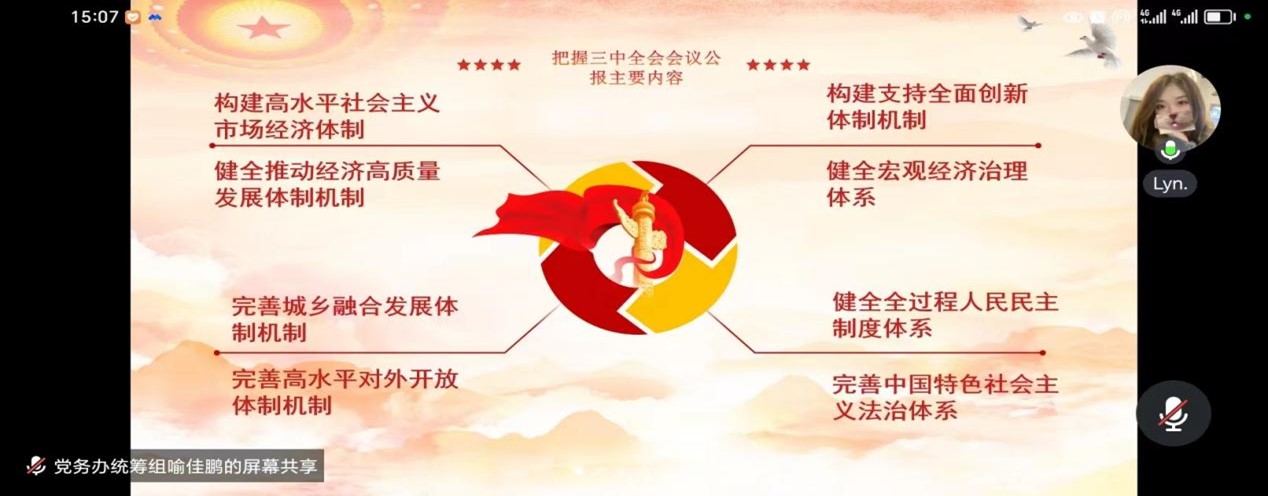在时代的浪潮中,青年党员是那股最澎湃、最有力的力量。为了深入学习贯彻党的二十届三中全会精神,引导广大青年党员坚定理想信念,勇担时代使命,三亿体育员工党支部于8月15日精心策划并开展了以“改革新征程,青春勇向前——学习贯彻党的二十届三中全会精神”为主题的八月“一课”线上学习活动。此次活动由公司员工党支部书记刘艳霓老师主讲,全体员工党员和预备党员积极参与,共同掀起了一场思想的风暴和精神的革命。