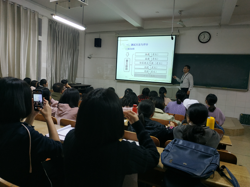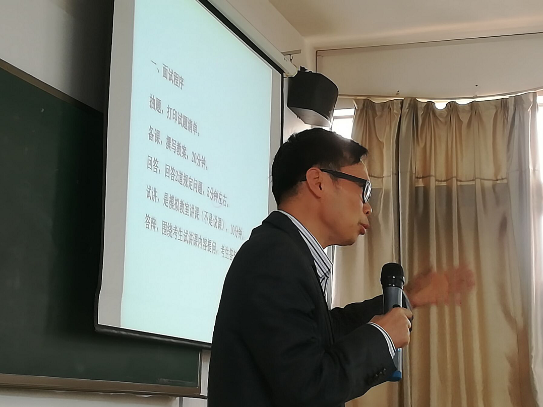 首先,周老师为我们介绍了面试的一般流程:抽题,打印试题清单;去往专门教室备课,撰写教案20分钟;回答2道结构化问题,5分钟左右;10分钟试讲,是模拟教室讲课;答辩,围绕考生试讲课内容提问考生答辩,5分钟左右。通过对面试流程的介绍,让同学们对面试的程序有了基本的了解为后面的面试奠定基础。