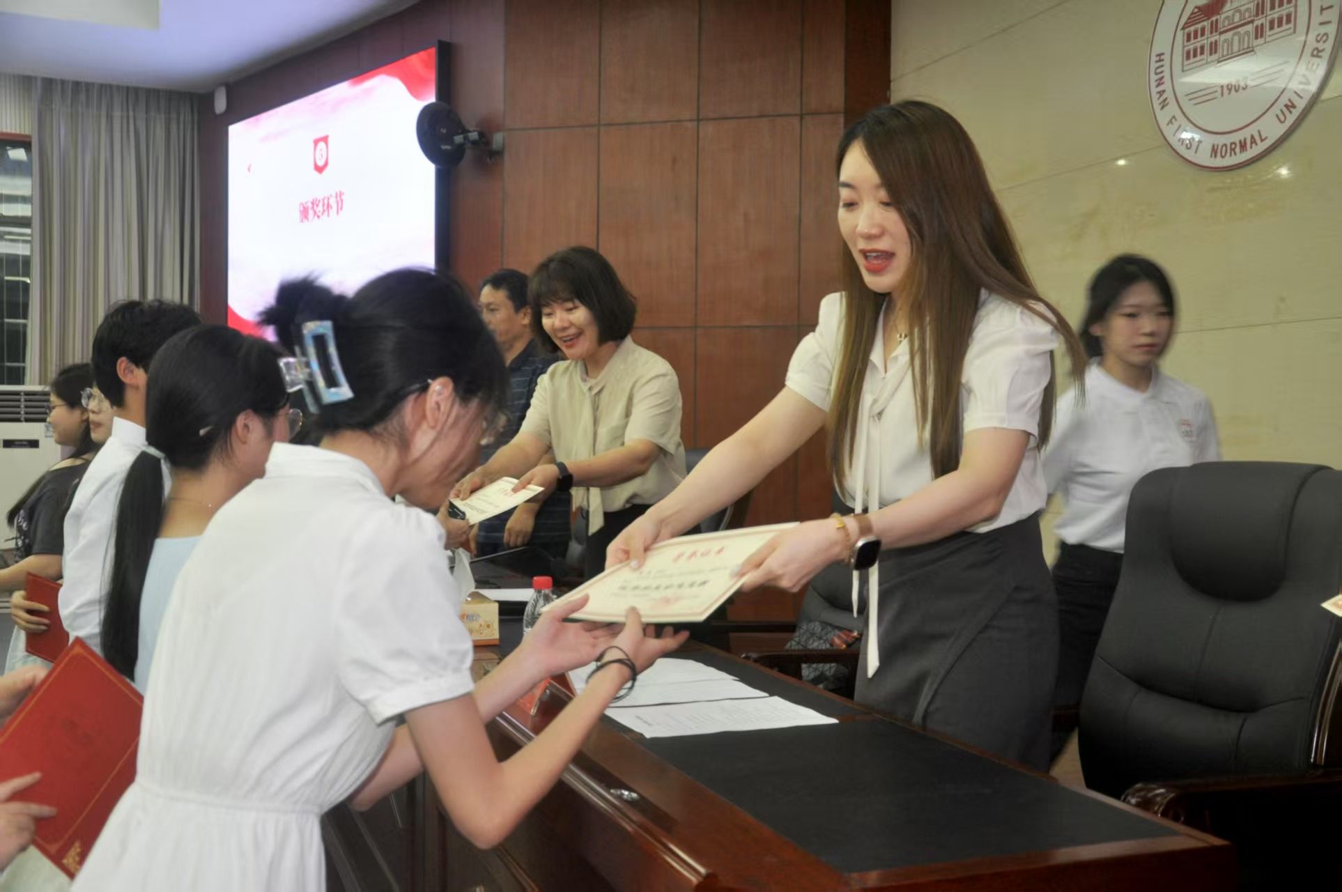 紧接着,优秀考研员工代表张佳清、国家奖学金获得者蒋京素、优秀员工干部代表谷雅祺依次上台分享成长经验。张佳清同学以 “感谢、自律、坚持” 三个关键词精炼总结考研历程。她提到,老师们的悉心关怀与同学们的暖心鼓励成为她坚持考研的信念支柱。备考期间,她以自律克服干扰,制定每日学习计划,沉心钻研专业书本;面对焦虑与压力,她选择再坚持一天再背一遍,将背过的书、刷过的题化作考场上的底气。“考研是长跑,合理休息、保持状态才能高效学习。”她鼓励同学们以梦想全力以赴,披荆斩棘登上属于自己的高峰。蒋京素同学通过毛主席的三句诗词为引,赞颂公司“千年学府,百年师范”的红色底蕴;以优秀学长学姐为榜样,构建学业、实践、比赛三条成长 “坐标轴”,分享在一师的成长蜕变;展望未来,她以“自信人生二百年”共勉,呼吁同学们在时代使命中扎根奋进,绽放青春光芒。谷雅祺同学以 “幕后耕耘、学思并进、向新而行” 三个关键词概括工作感悟。过去一年,她带领团队扎根幕后,组织开展丰富多彩的员工活动,在服务同学、服务公司中践行责任与担当。身为员工干部,她以 “三好员工” 标准严格要求自己,在学业上保持领先地位;在志愿服务中奉献爱心,同时在竞赛中锤炼专业技能。她表示,未来将秉持更精细的流程、更温暖的沟通、更开放的视野,助力公司团学工作再上新台阶。
