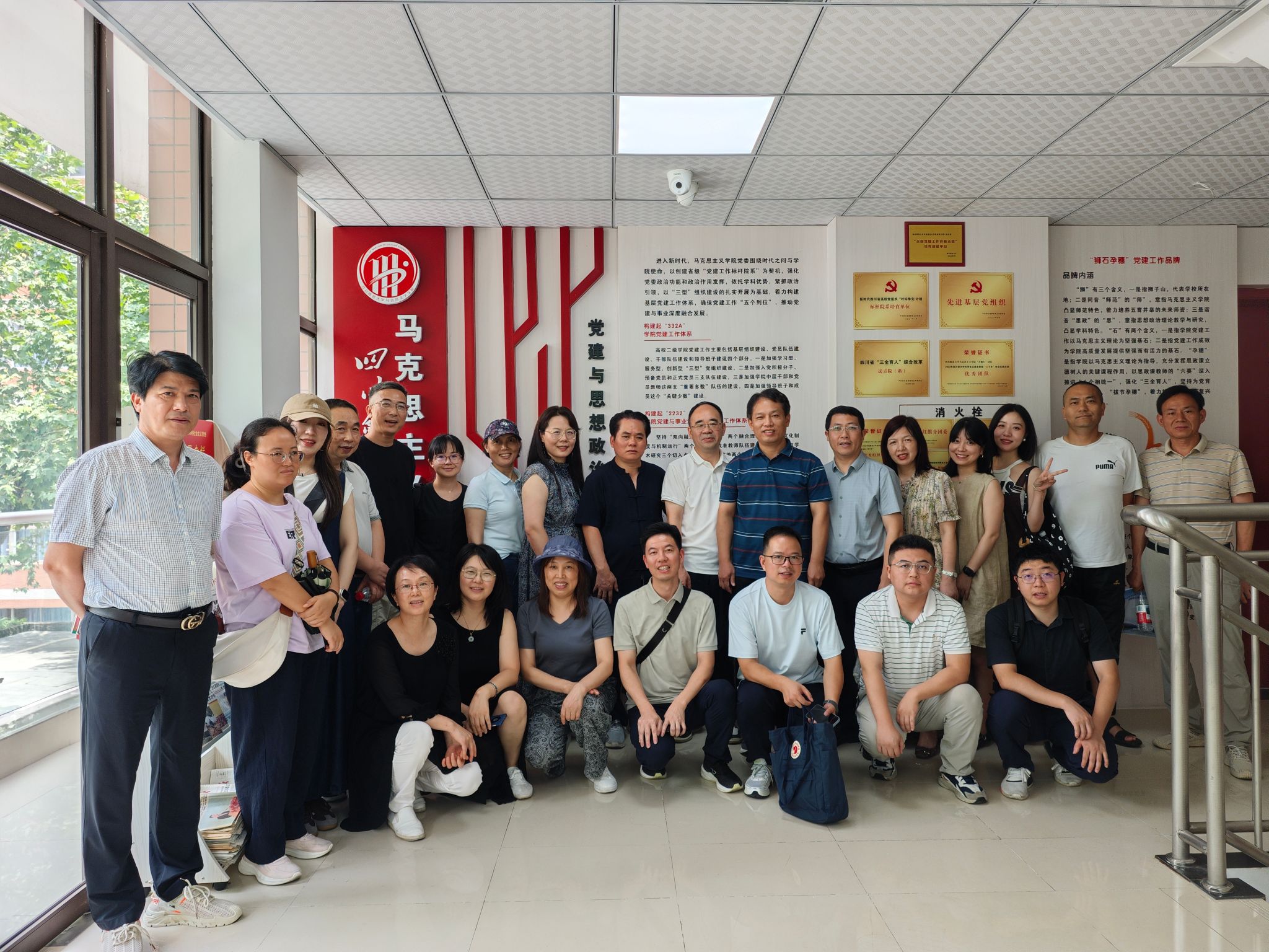 讲座结束后,参训教师集中参观了川师大党建文化墙,胡尚峰重点介绍了川师大马院“狮石孕穗”党建工作品牌,以及党建引领下的教师工作子品牌“狮石孕穗·明德馨师”、员工工作子品牌“狮石孕穗·至诚青马”,通过品牌化建设,构建起“3333“全面从严治党工作体系,切实提升了基层党建工作的凝聚力、引领力,增强了思政课的育人实效,赢得了参训教师的一致好评。