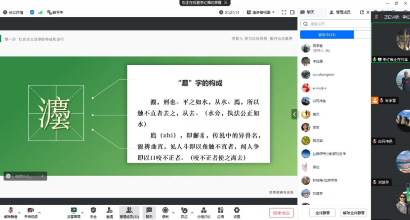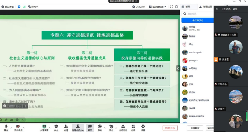 11月17日晚上,公司与拉萨高等师范专科公司思政部共同举行“思想道德与法治”线上集体备课。在主讲环节,滕茜茜老师、李红雁老师分别展示了备课内容。滕茜茜老师主讲道德实践专题,分别从社会公德、职业道德、家庭美德和个人道德做了详细展示,内容丰富,案例鲜活,紧贴社会实际。李红雁老师主讲社会主义法治专题,以案说法,深入浅出,生动地展示了法律的基本概念,法律的指定、执行等环节。在随后的点评环节,老师们对展示内容进行了热烈讨论,充分肯定了主讲老师展示的优点亮点,提出了相关建议,并总结自己在备课和教学中的心得和经验,充分发挥集体智慧,把专题内容打造得更加丰富更加精美。