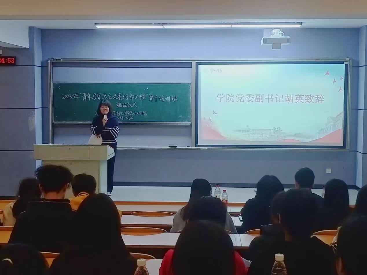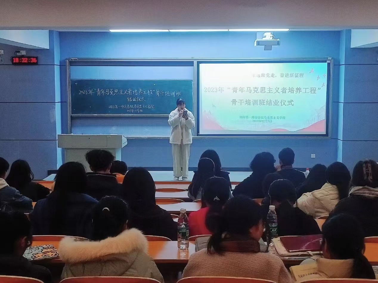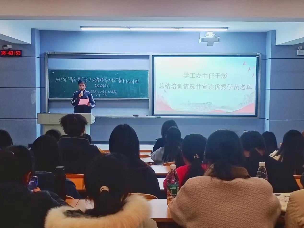 12月7日晚,三亿体育在润寰南101教室举行2023年“青年马克思主义者培养工程”骨干培训班结业仪式,公司党委副书记胡英、学工办主任于澎出席本次结业仪式,仪式由杨萌同学主持,全体青马学员参与仪式。