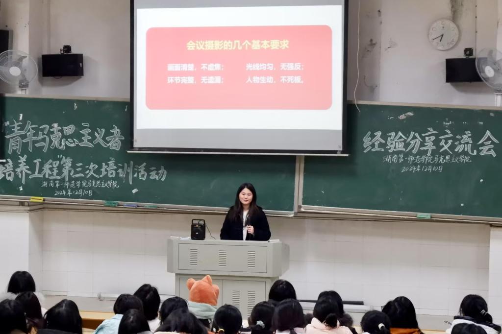 活动伊始,分团委宣传部的成员为大家带来了摄影技巧和新闻稿撰写方面的专业培训。摄影队的肖紫媛细致入微地讲解了摄影的基本技巧,并针对光线不足、镜头虚焦等常见问题,提出了有效的解决方案,如利用曝光补偿改善光线、通过画面构图避免镜头虚焦等。紧接着,编辑社的朱玲瑶则深入浅出地介绍了新闻稿的写作规范,详细剖析了新闻稿的结构、要素、类型及写作技巧,现场气氛热烈,同学们聚精会神地聆听,并积极与主讲人进行互动交流。