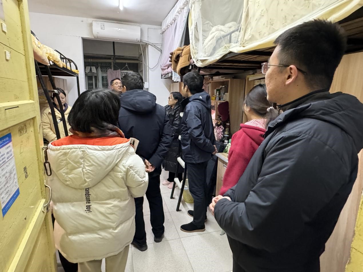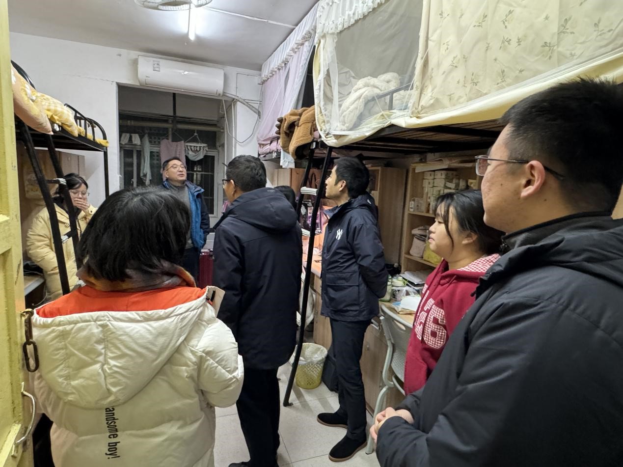 12月23日,学工部部长周大庆,马克思主义公司党委书记阮东彪,学工办主任于澎带领辅导员深入员工宿舍走访,关心员工期末备考情况,鼓励同学们向优秀学长学姐看齐,学习备考经验、提高备考效率。并提醒同学们预防冬日火灾,避免使用大功率电器与易燃物品,共同维护宿舍安全,打造安全健康的生活环境、学习环境。