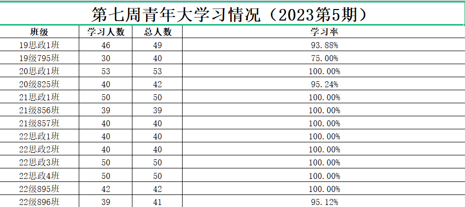 总结: 在本次青年大学习,20思政1班、21思政1班、21级856班、21级857班、22思政1班、22思政2班、22思政3班、22思政4班、22级895班学习率达到了100%,在这里提出表扬;