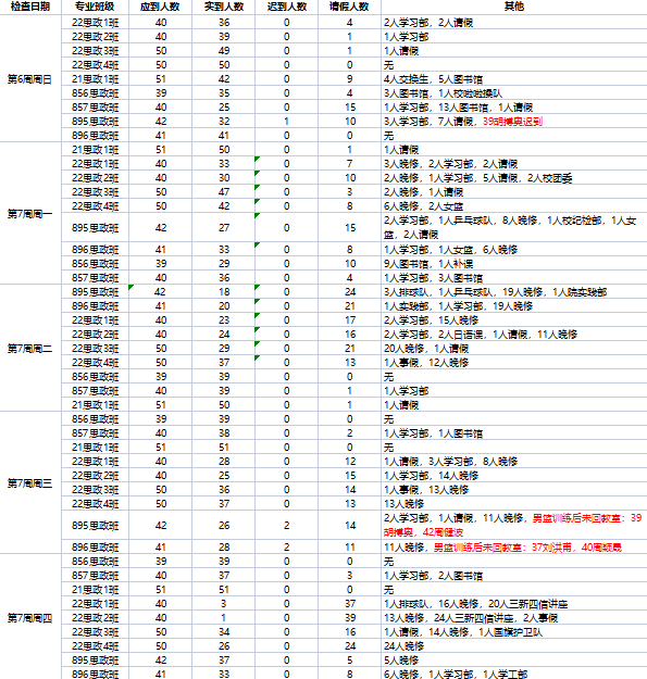 本周早自习情况总体良好,但仍有个别同学未按时参加早自习,名单如下:21级思政856班36号陈文铮、37号粟宇、38号王俊、41号黄书坤;21级思政857班13号吴伊蕾、19号贺兰芳、26号李冰冰、35号杨周琳、37号田畅轩、41号丁嘉豪;22级思政895班39号胡博奥、42号周建波。对以上同学予以提醒一次处理,望其他同学引以为戒。
