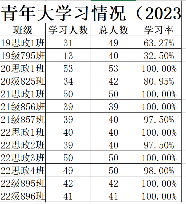 总结: 在本次青年大学习,20思政1班、21思政1班、21级856班、22思政1班、22思政3班、22级895班、22级896班学习率达到了100%,在这里提出表扬;