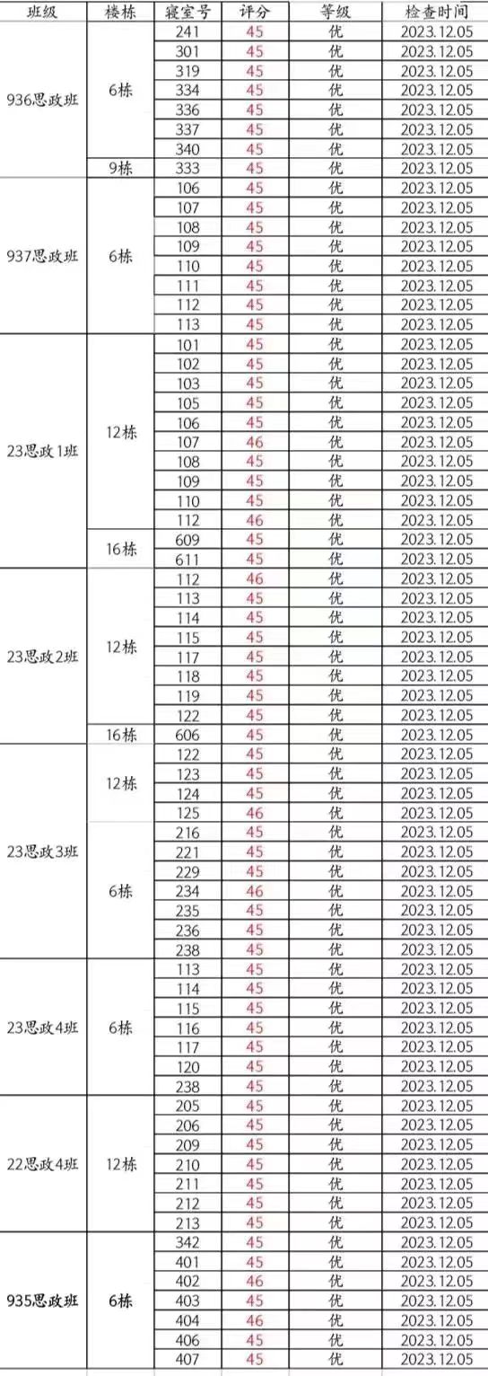 本周大检情况良好,但差寝数量较上周有所增加。其中857思政班16-137(丁嘉豪、周靖浩、符灿宇、田畅轩)、896思政班6-641(芦艺丹、陈萝玥、谭佳、雷奕林)、936思政班的6-329(陶淑颖、邝映羲)、6-339(何琳、孙诗琴、曹燕萍、龚紫鑫)与16-618(杨恩旭、刘锦洋、张汗泽、傅灏文)、937思政班6-105(姜添娇、刘媛、刘思思、杜佳仪)与16-616(张祺、余志纬、李鑫益、何佳旭)、23思政1班16-615(杨程、李书畅、陈国颖、全启航)等宿舍仍需继续努力。希望大家共同努力,建设文明美丽公寓!