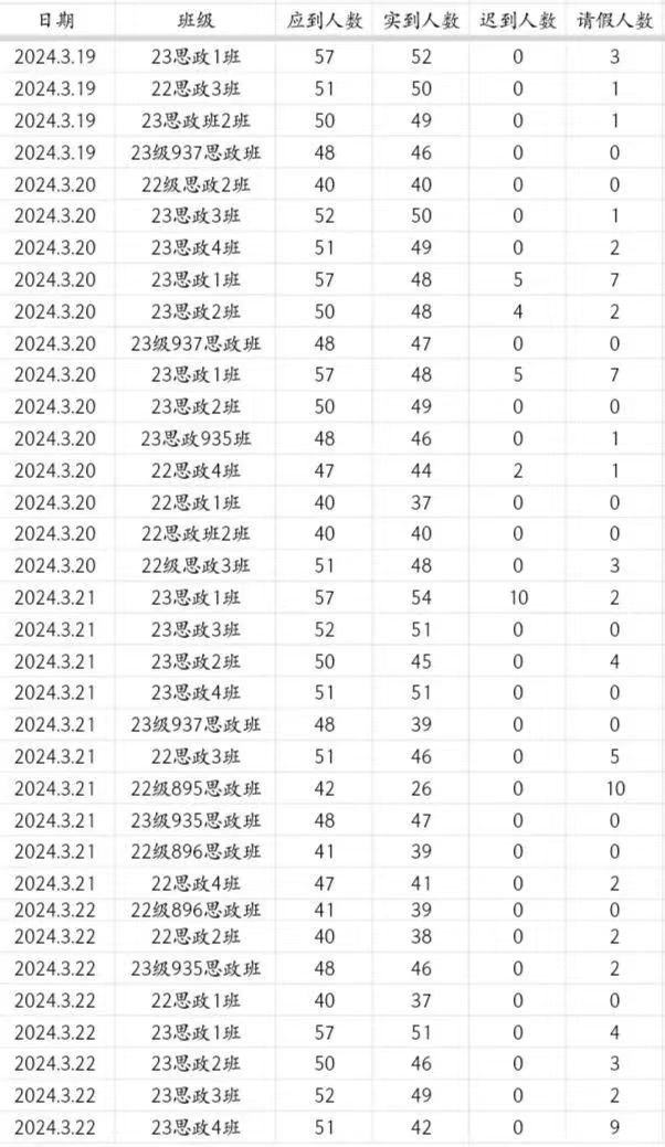 937班旷课(12人):2陈怡冰、11何喧、12杜佳仪、21袁丽琴、24万源源、34毛浏畅、36刘思思、44余志纬、45陈国颖、46李鑫益、47全启航、48何佳旭。