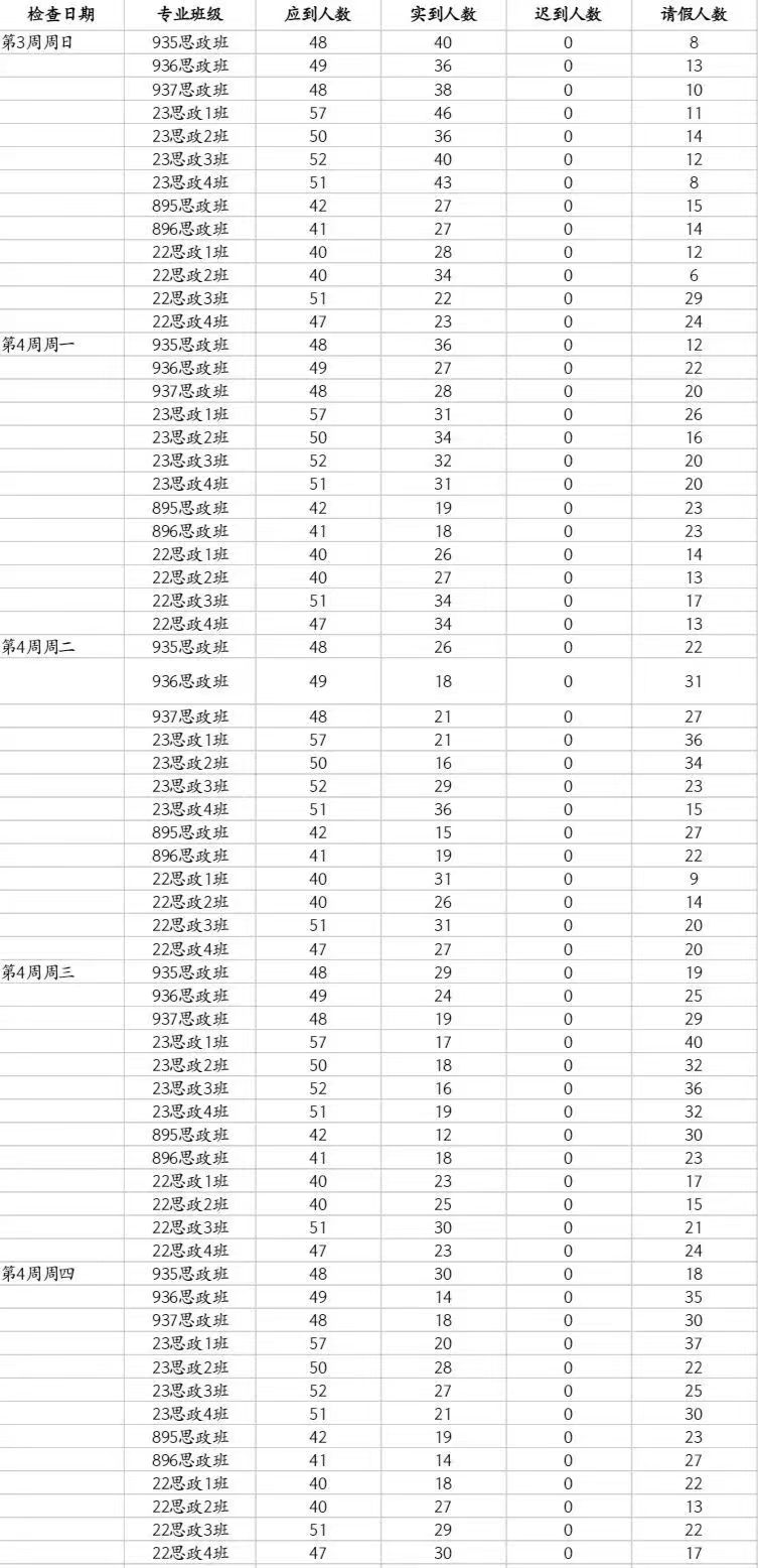 周一升旗,故早自习取消。本周早自习大部分班级表现良好,22思政4班7号刘婉婷,23号唐叶,34号吴婷,48号刘耘彤缺席。