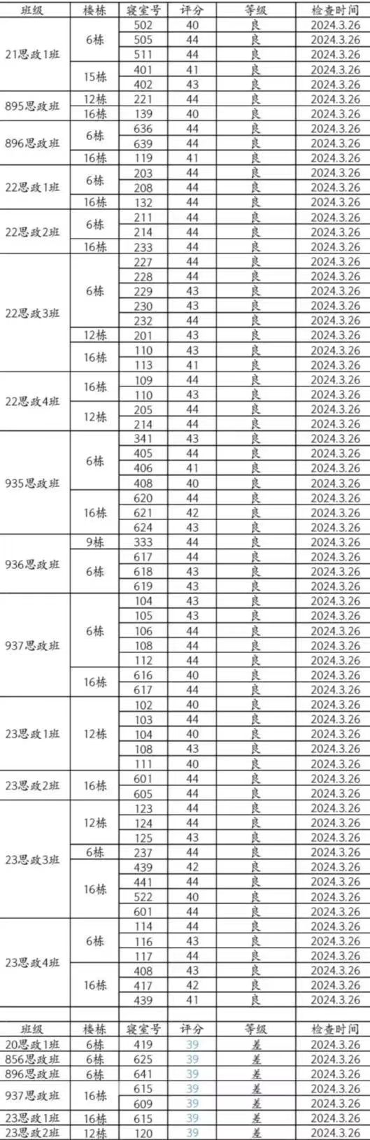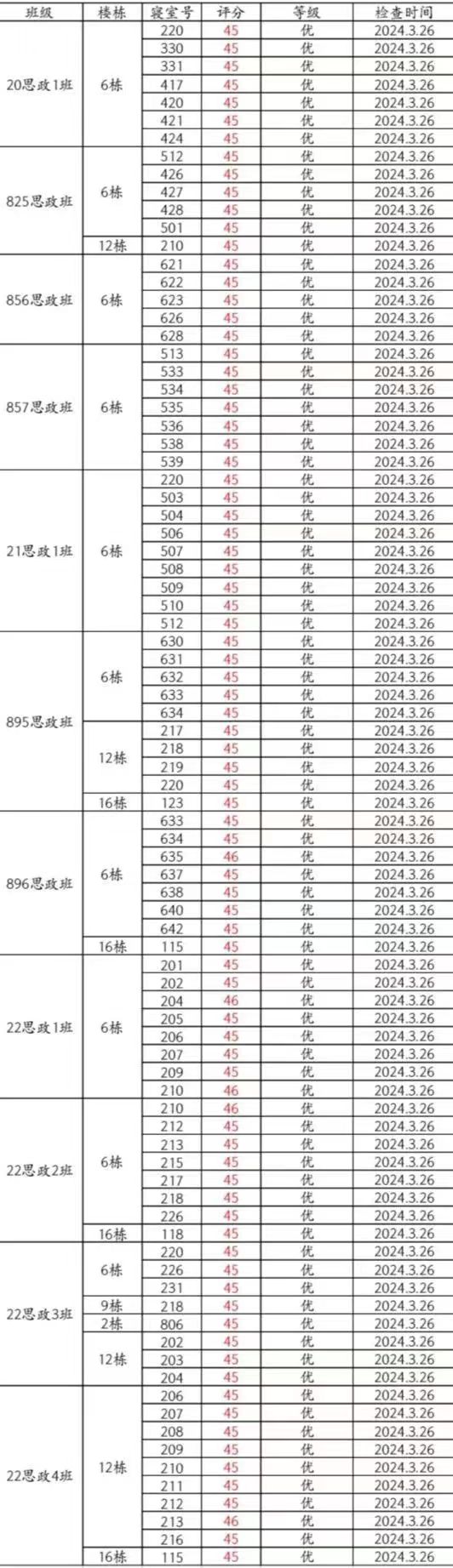 本周卫生大检优寝比率较之前有所提高,总体表现良好,但20思政1班6-419(曾佳、苏心妍、尹佳怡、陈思怡)、856思政班6-625(李妍霏、周思彤、唐欣柔、欧雅婷)、896思政班6-641(芦艺丹、陈萝玥、谭佳、雷奕林)、937思政班与23思政1班混寝16-615(杨程、李书畅、陈国颖、全启航)等宿舍仍需继续改进!希望大家共同努力,建设文明美丽宿舍!