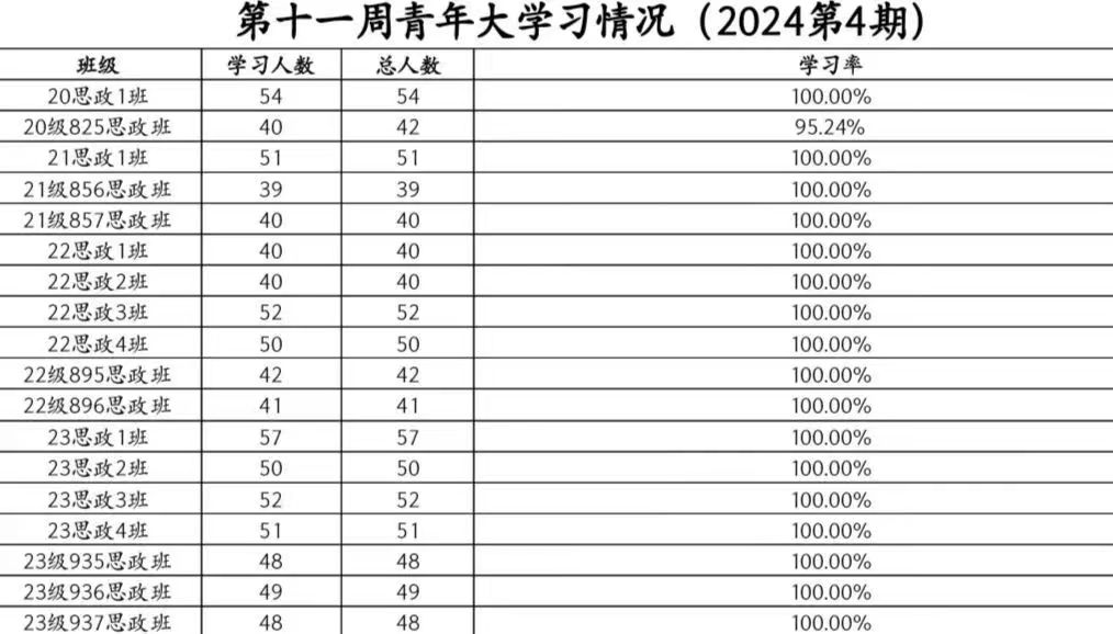 在本次青年大学习,20思政1班,21级856思政班,21级857思政班,21思政1班,22思政1班,22思政2班,22思政3班,22思政4班,22级895思政班,22级896思政班,23思政1班,23思政2班,23思政3班,23思政4班,23级935思政班,23级936思政班,23级937思政班学习率达到了100%,在这里提出表扬;