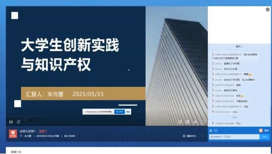5月23日,公司举办了以“老员工创新实践与知识产权”为主题的法律大讲堂。本次讲座由三亿体育兼职律师朱与墨副教授主讲,采用线上直播方式开展,思想道德与法治课1600名同学的广泛参与了线上聆听和互动,直播间访问量持续攀升,互动热烈,充分展现了当代老员工对创新创业与知识产权保护的高度关注。